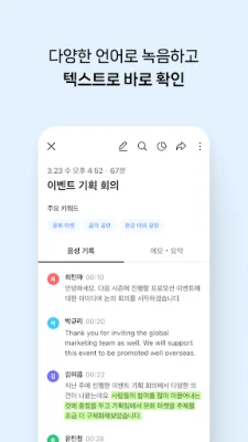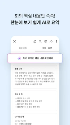 클로바노트는 회사의 모든 회의를 기록하고 요약해주는 앱입니다. 모바일과 PC에서 언제 어디서든 녹음을 시작할 수 있어요. 녹음 상황이나 환경에 따라 편하게 노트를 생성할 수 있고, 다양한 언어로 녹음할 수 있어요. 한국어, 영어, 일본어, 중국어 대화도 텍스트로 확인할 수 있어요. 녹음 중 기억하고 싶은 내용이 있다면 바로 메모해 두세요. 작성 시간도 함께 기록되어 대화 맥락을 파악하기가 쉬워요. 중요한 대화를 찾기 쉽게 녹음 중 북마크를 추가해 보세요. 북마크 한 부분만 모아보거나 바로 재생할 수도 있어요. AI가 자동으로 정리해 주는 핵심 내용만 확인해 보세요. 자동 추출된 요약/주요 주제/다음 할 일은 편집도 가능해요. 통화 자동 녹음을 ON 하면 음성 파일이 자동 분류돼요. 텍스트 미리 보기 해서 원하는 통화만 변환할 할 수 있어요. 중요한 내용은 하이라이트로 강조해 보세요. 하이라이트 한 부분만 한눈에 모아볼 수도 있어요. 필요한 내용만 검색해서 빠르게 찾을 수 있어요. 찾은 단어를 수정하고 싶다면 한 번에 바꾸기도 가능해요. 대화 참석자들에게 노트를 링크로 간편하게 공유해 보세요. 보안이 필요한 경우 비밀번호 설정 후 공유할 수 있어요. 녹음한 음원, 음성기록, 메모를 파일로 다운로드할 수 있어요. 원하는 파일 형식으로 다운로드해서 활용해 보세요. 모바일 앱, PC는 자동으로 연동되어 사용할 수 있어요. 통화 기록처럼 따로 녹음한 음성 파일도 불러올 수 있어요.