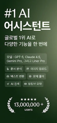 💡 요약설명: 1,300만 명 이상의 사용자가 신뢰하는 Liner AI는 OpenAI 벤치마크에서 입증된 높은 사실성을 바탕으로, 질문, 사진, 유튜브, 파일 등 다양한 형태의 정보를 정확하고 이해하기 쉽게 요약하고 분석해주는 스마트 AI 어시스턴트입니다.