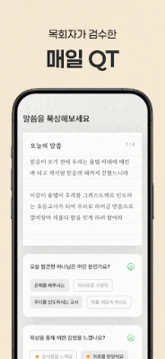 매일 큐티묵상과 기도 습관을 만들 수 있는 기능도 제공합니다. 국내 12명의 다양한 교단 목사님이 매일 집필하는 큐티(QT) 묵상을 제공합니다. 또한 묵상 노트를 통해 오늘의 말씀, 묵상, 기도문을 기록하고 자동으로 저장할 수 있습니다. 기도문 자동 생성 기능을 통해 테마별, 상황별 맞춤 기도를 제공합니다. 묵상 SNS/카카오톡 공유 기능을 통해 큐티, 묵상, 은혜, 기도를 손쉽게 전송할 수 있습니다. 또한 매일 묵상/기도로 영적 성장을 눈으로 확인할 수 있는 새싹 키우기 게임을 제공합니다. 기도노트, 기도요청, 기도 응답 체크 기능을 통해 꾸준한 기도 습관을 만들 수 있도록 도와줍니다. 또한 교회, 소그룹, 교구와 온라인 QT 나눔을 할 수 있도록 도와줍니다.