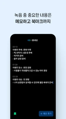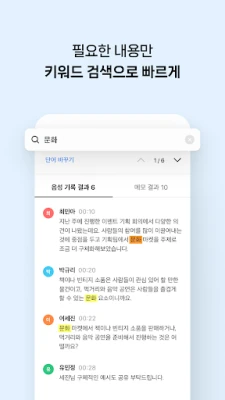 클로바노트는 회사의 모든 회의를 기록하고 요약해주는 앱입니다. 모바일과 PC에서 언제 어디서든 녹음을 시작할 수 있어요. 녹음 상황이나 환경에 따라 편하게 노트를 생성할 수 있고, 다양한 언어로 녹음할 수 있어요. 한국어, 영어, 일본어, 중국어 대화도 텍스트로 확인할 수 있어요. 녹음 중 기억하고 싶은 내용이 있다면 바로 메모해 두세요. 작성 시간도 함께 기록되어 대화 맥락을 파악하기가 쉬워요. 중요한 대화를 찾기 쉽게 녹음 중 북마크를 추가해 보세요. 북마크 한 부분만 모아보거나 바로 재생할 수도 있어요. AI가 자동으로 정리해 주는 핵심 내용만 확인해 보세요. 자동 추출된 요약/주요 주제/다음 할 일은 편집도 가능해요. 통화 자동 녹음을 ON 하면 음성 파일이 자동 분류돼요. 텍스트 미리 보기 해서 원하는 통화만 변환할 할 수 있어요. 중요한 내용은 하이라이트로 강조해 보세요. 하이라이트 한 부분만 한눈에 모아볼 수도 있어요. 필요한 내용만 검색해서 빠르게 찾을 수 있어요. 찾은 단어를 수정하고 싶다면 한 번에 바꾸기도 가능해요. 대화 참석자들에게 노트를 링크로 간편하게 공유해 보세요. 보안이 필요한 경우 비밀번호 설정 후 공유할 수 있어요. 녹음한 음원, 음성기록, 메모를 파일로 다운로드할 수 있어요. 원하는 파일 형식으로 다운로드해서 활용해 보세요. 모바일 앱, PC는 자동으로 연동되어 사용할 수 있어요. 통화 기록처럼 따로 녹음한 음성 파일도 불러올 수 있어요.